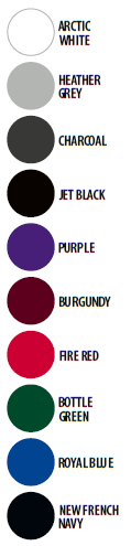 Arctic White, Bottle Green, Burgundy, Charcoal, Fire Red, Heather Grey, Jet Black, New French Navy, Purple, Royal Blue