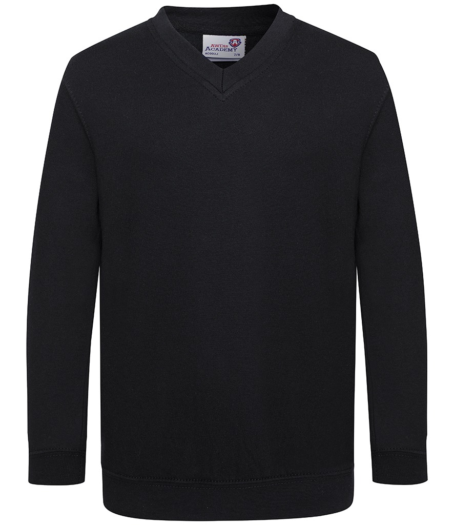 V-neckline sweatshirt. Ribbed neckline, cuffs and hemline. Soft cotton faced fabric creates ideal printing surface. Name label. Taped neck at back neck. Twin needle stitching for durability. Worldwide Responsible Accredited Production (WRAP) certified production. Set in sleeves. WRAP certified. Vegan certified. SEDEX certified.