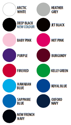 | Colour | Arctic White, Baby Pink, Burgundy, Deep Black, Fire Red, Hawaiian Blue, Heather Grey, Hot Pink, Jet Black, Kelly Green, New French Navy, Oxford Navy, Purple, Royal Blue, Sapphire Blue |