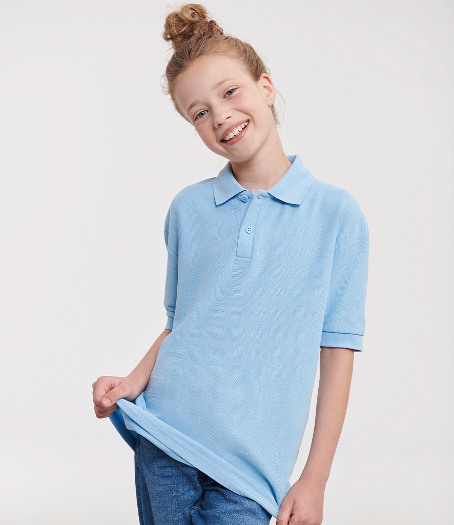 Unique double yarn pique provides an exceptionally soft feel and increased shape retention. Neck tape for wearer comfort and durability. Classic style flat knit cuffs. Spare button inside seam. Reinforced shoulder seams. Twin needle hem at bottom for added stability.