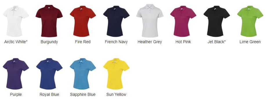 Arctic White, Bottle Green, Burgundy, Charcoal, Desert Sand, Electric Green, Electric Orange, Electric Pink, Electric Yellow, Fire Red, French Navy, Gold, Heather Grey, Hot Pink, Jet Black, Kelly Green, Lime Green, Orange Crush, Purple, Reflex Blue, Royal Blue, Sapphire Blue, Sky Blue, Sun Yellow, Turquoise