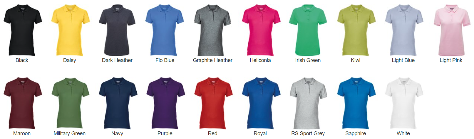 | Colour | Black, Daisy, Dark Heather, Flo Blue, Graphite Heather, Heliconia, Irish Green, Kiwi, Light Blue, Light Pink, Maroon, Military Green, Navy, Purple, Red, Royal Blue, RS Sports Grey, Sapphire Blue, White |