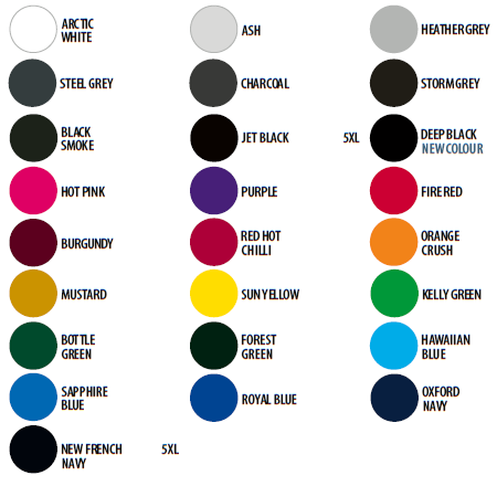 | Colour | Arctic White, Ash, Black Smoke, Bottle Green, Burgundy, Charcoal, Deep Black, Fire Red, Forest Green, New French Navy, Hawaiian Blue, Heather Grey, Hot Pink, Jet Black, Kelly Green, Orange Crush, Oxford Navy, Purple, Red Hot Chilli, Royal Blue, Sapphire Blue, Sun Yellow, Steel Grey, Storm Grey |